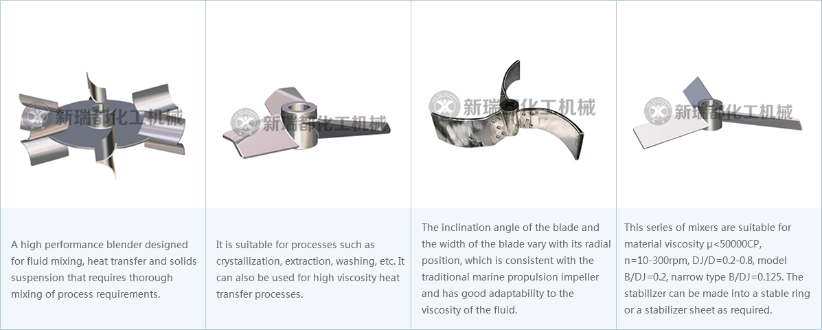 The propulsion type is the most typical axial flow agitator, high liquid discharge capacity, low shear performance: the baffle or the guide tube is used for stronger axial circulation, and the discharge performance is obviously improved because of its high cycle capacity and low power consumption. In the low viscosity, large-capacity homogeneous phase, mixing process & emsp; the application can best reflect its advantages, in low-viscosity liquid heat transfer, reaction, solid-liquid ratio suspension, dissolution and other processes are widely used. The adjustable propeller blades can be rotated by ±15° to adjust the inclination and play a large role in the experimental process. The detachable propeller-type paddle wheel is divided into three debates and is easy to assemble, and is used in occasions where it is required to be broken into small pieces. Common medium, μ<2000cP, common running speed n=10-500rpm, v=3-15m/s, maximum speed up to 1750rpm, common specification S/DJ=1 or 2, DJ/D=0.2-0.5 surface required polishing The welding type must be selected for the treatment.