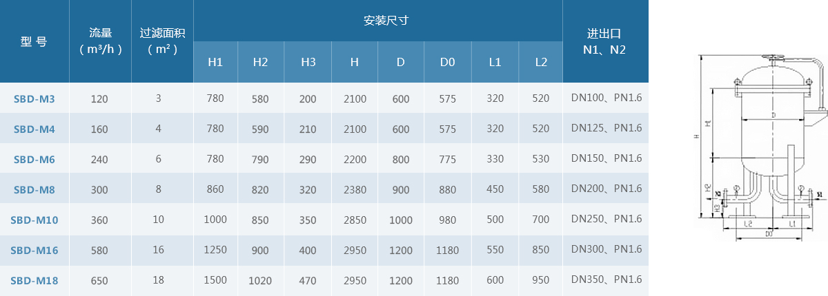 SBD系列袋式过滤器适用于任何细微颗粒(<1000ppm)的过滤,精度范围可从1至1000μm,处理从1至1000m3/h的液体过滤。
